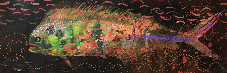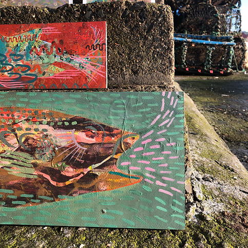 There was a fair amount of tentative mark making, then getting annoyed and chucking paint around.. but nothing felt new or exciting… until… a fish appeared. The first one was very cartoon like but gave me the idea to do another one, and then another one.. and now there are 10!